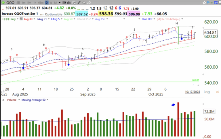 Last August I wrote that I saw a possible head and shoulders top pattern forming, but the market broke above the right shoulder and moved higher instead. I have drawn in another possible head and shoulders pattern in QQQ that has been forming. This week we will see if it is resolved like the earlier one, or is really a top. The  steep decline on October 10, noted by an arrow on this chart, occurred with the largest trading volume in months and is very troubling to me. But our job is to react and not to predict. So let’s see what this earnings filled week brings. A close below 589.05 would be a sign of extreme weakness. I am ready to go long or short once this pattern is resolved.