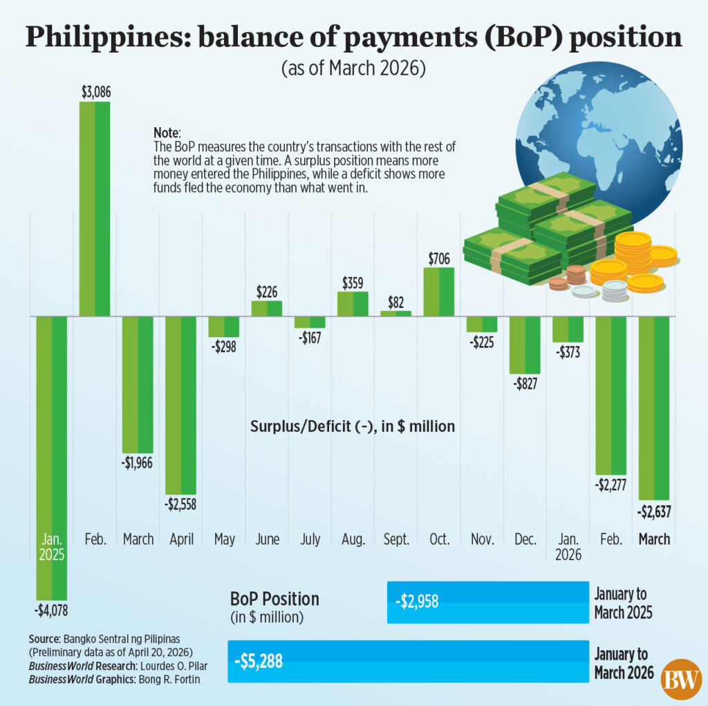 THE Philippines’ balance of payments (BoP) deficit widened in March, driven by the elevated trade gap and heightened geopolitical uncertainty, Bangko Sentral ng Pilipinas (BSP) data showed on Monday.