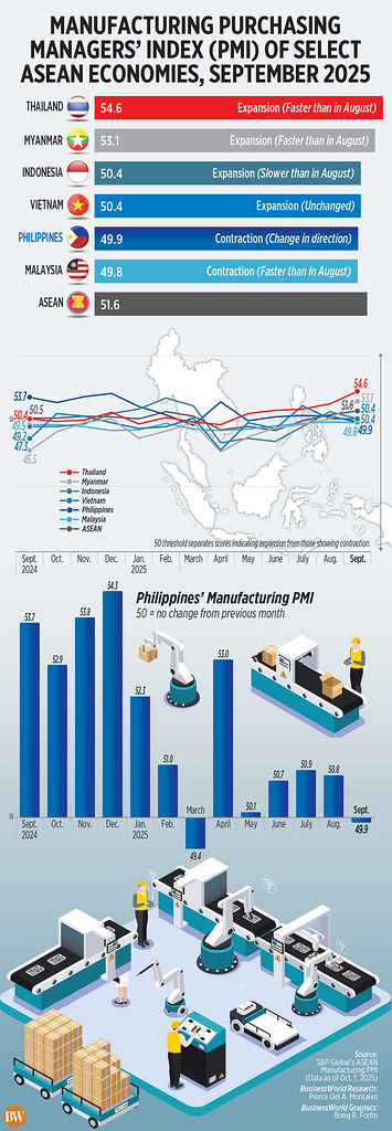 Based on S&P Global’s Association of Southeast Asian Nations (ASEAN) data, the Philippines and Malaysia (49.8) both saw a contraction in factory activity in September.