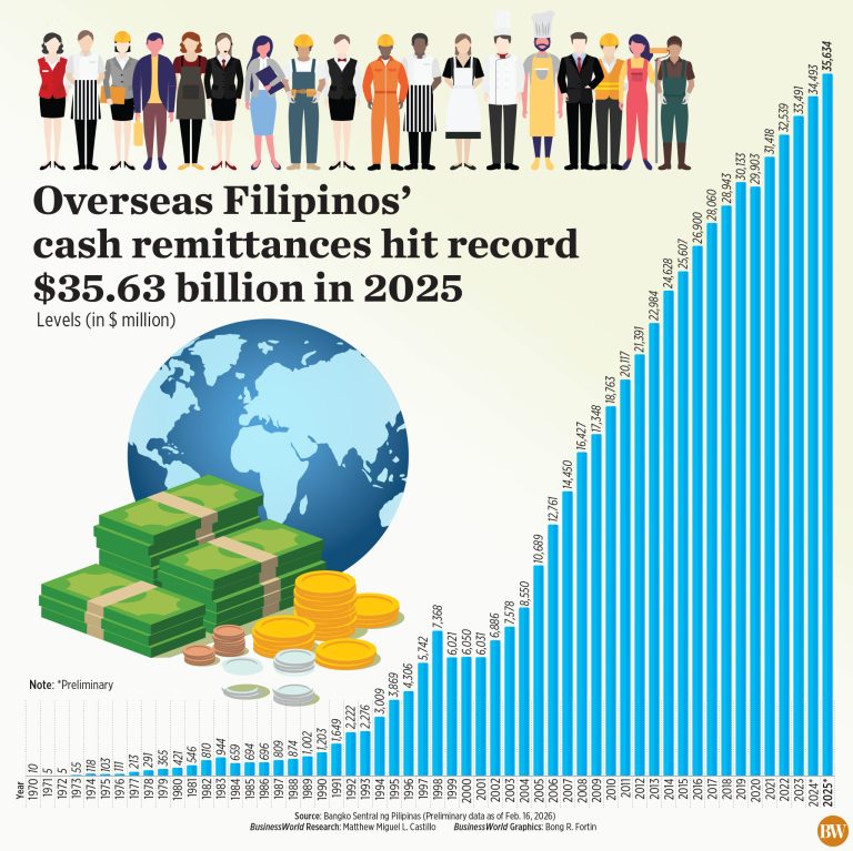 BSP data showed total cash remittances rose by 3.3% year on year to $35.634 billion in 2025 from $34.493 billion in 2024.