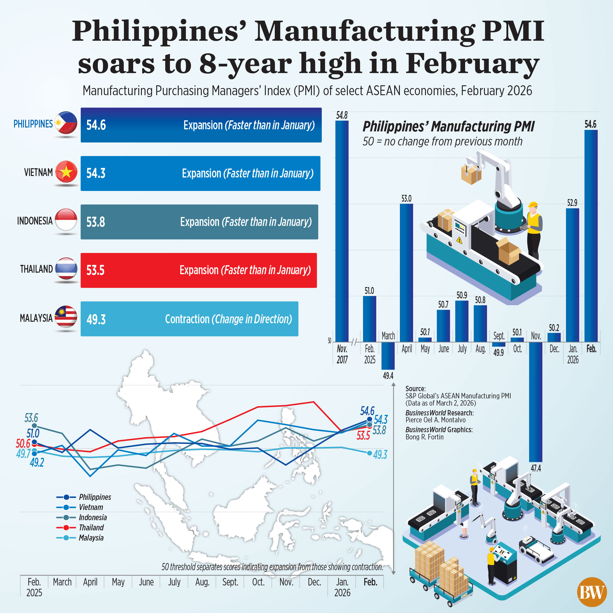 Based on available data from S&P as of Monday, the Philippines was ahead of Vietnam (54.3), Indonesia (53.8) and Thailand (53.5). Malaysia saw a deterioration in PMI to 49.3.