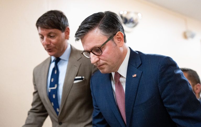 Speaker of the House Mike Johnson (R-LA) leaves the House Republican Conference caucus meeting in the US Capitol on July 22, 2025.