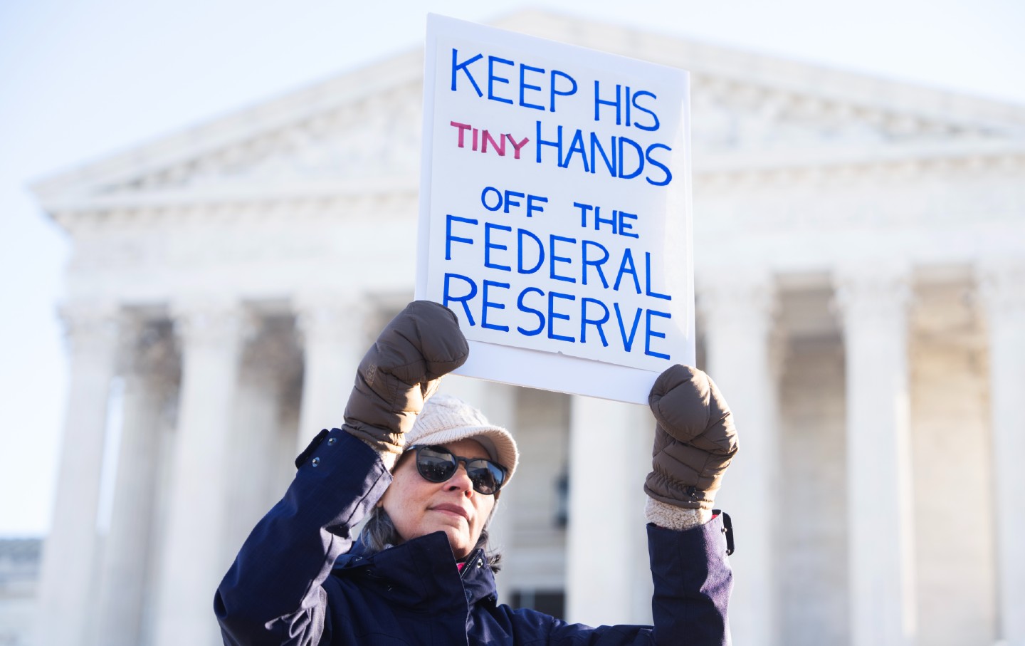 A woman protested outside the Supreme Court as it heard oral arguments in Trump v. Cook, about’s Trump’s attempt to fire Lisa Cook from the Federal Reserve Board of Governors.