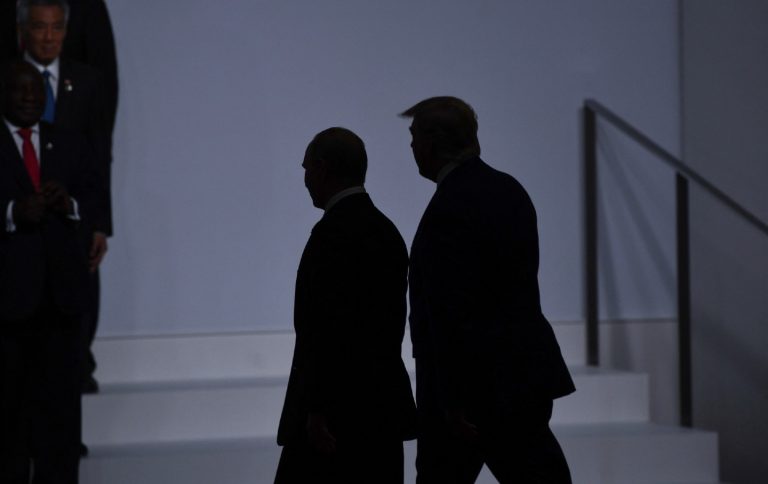 Donald Trump walks with Vladimir Putin before taking a family photo at the G20 Summit in Osaka on June 28, 2019.